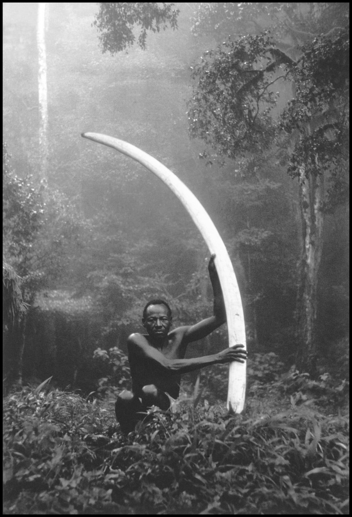 A Kenyan man identified as Elui poising with an elephant tusk, 1962.